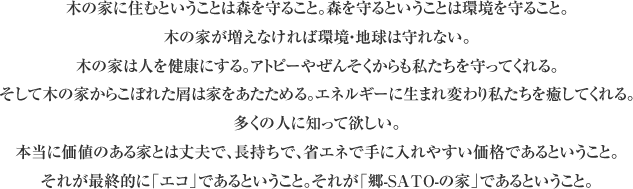木の家に住むということは森を守ること。森を守るということは環境を守ること。 木の家が増えなければ環境・地球は守れない。 木の家は人を健康にする。アトピーやぜんそくからも私たちを守ってくれる。 そして木の家からこぼれた屑は家をあたためる。エネルギーに生まれ変わり私たちを癒してくれる。 多くの人に知って欲しい。 本当に価値のある家とは丈夫で、長持ちで、省エネで手に入れやすい価格であるということ。 それが最終的に「エコ」であるということ。それが「郷-SATO-の家」であるということ。