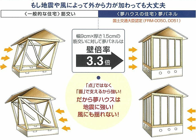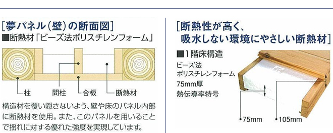床と壁には強度と断熱性が友に高い「夢パネル」を使いますので、窓などの開口部を広く取ることができます。また、「壁倍率3.3倍」を誇り、地震、台風、洪水などの災害にとても強いのが特徴です。 夢パネルの断熱材はビーズ法ポリスチレンフォームを使用しています。吸水性が低く湿気の影響をほとんど受けません。また自消性があり、燃やしても有害ガスの発生が極めて少ない。