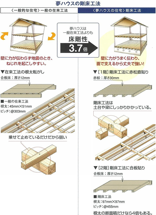 1階と2階の床下に大引き45cm間隔で施工し、地震による揺れの力を床と壁の面でしっかいr支える頑強な構造です。地震に対してこの「剛床工法」は、公庫仕様の3.7倍の強度を誇ります。