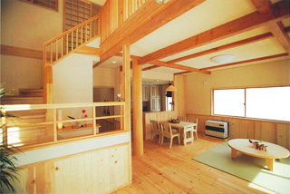 夢ハウスは、強度の高い天然無垢材や工法により木組みの大空間を実現。他社と同じ床面積でも空間の広さ(体積)は1.5倍です。